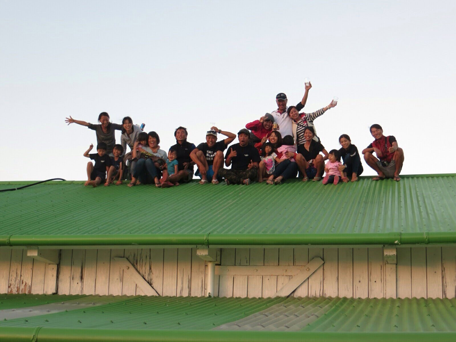 西表島に沈む夕陽を見ようと、みんなで屋根に登ったら、ぴったり20人でした!