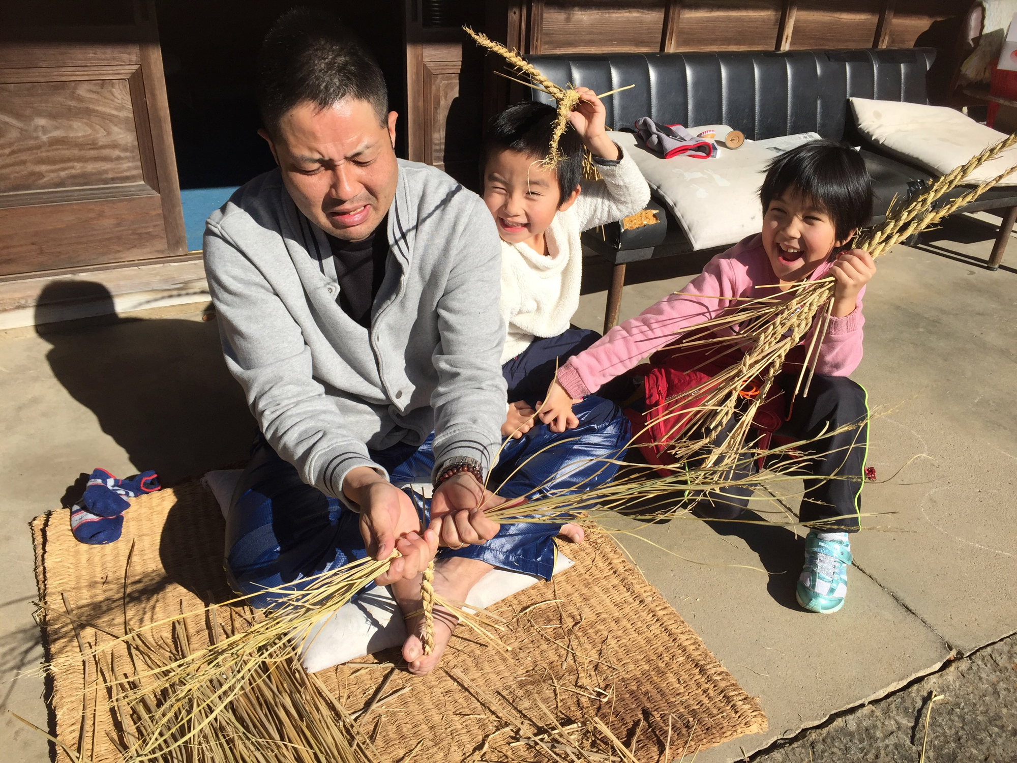 大晦日、毎年恒例のしめ縄づくりの様子です。夫が一生懸命しめ縄をつくる横で、子ども達がちょっかいを出して遊んでいました。