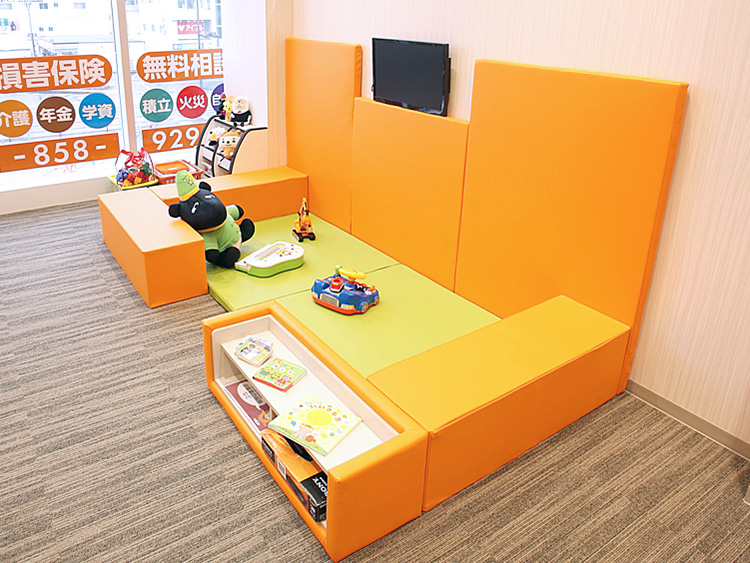当保険ショップでは、小さなお子さま連れでも安心してご相談いただけるようキッズスペースを完備しています。駐車場もご用意しておりますので、お車でのお越しも便利です。