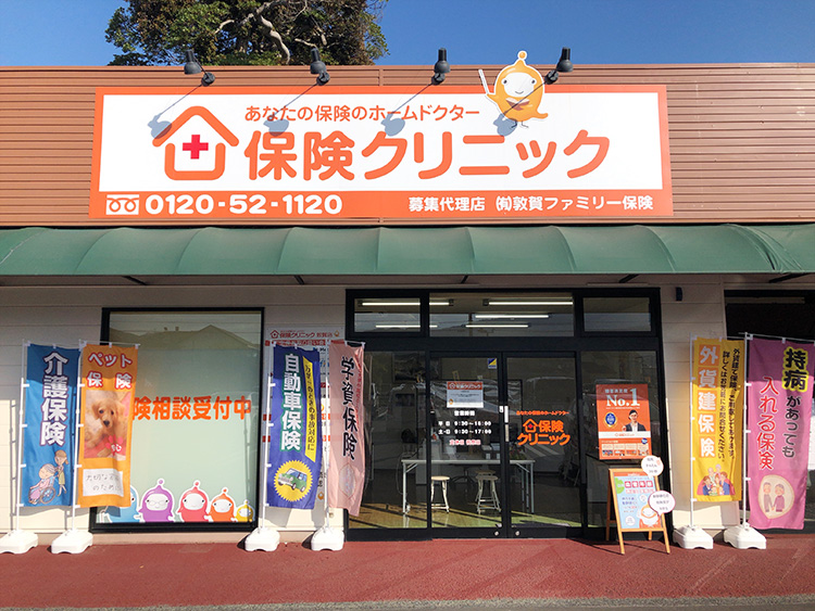 多くの保険ショップはショッピングモールなどにぎやかな場所にあり「まわりに話を聞かれるのでは?」という方も多くいらっしゃいます。保険クリニック敦賀店は、福井県敦賀市内、県道211号線沿いの店舗ですので、しずかな環境で無料の保険相談、保険見直しサービスをご利用いただけます。生命保険・損害保険合わせ約15社の保険を取扱う乗合代理店が運営しているので、医療保険や、がん保険、学資保険や個人年金保険をはじめ、介護に備える介護保険や火災保険・自動車保険のご相談をお受けしています。ヤスサキグルメ館の前でもあるので、お買いもの帰りにパンフレットを取りに来るお客様も多くいらっしゃいます。敦賀市はもちろん、長浜市などからご来店いただくこともしばしばです。