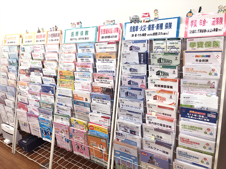 店内には、生命保険・損害保険各社のパンフレットを取りそろえています。 店頭でお渡しできますので、お気軽にお声かけください。