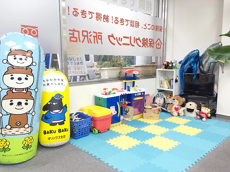 ぬいぐるみやおもちゃがたくさんのキッズスペースも完備!お子様連れでのご来店も安心です。