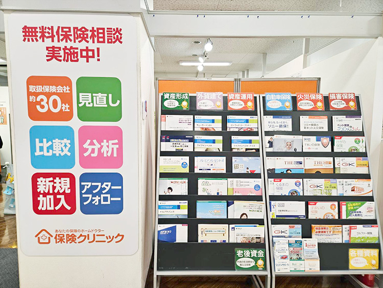 医療保険やがん保険、学資保険など。各社のパンフレットをお持ち帰りいただけます。