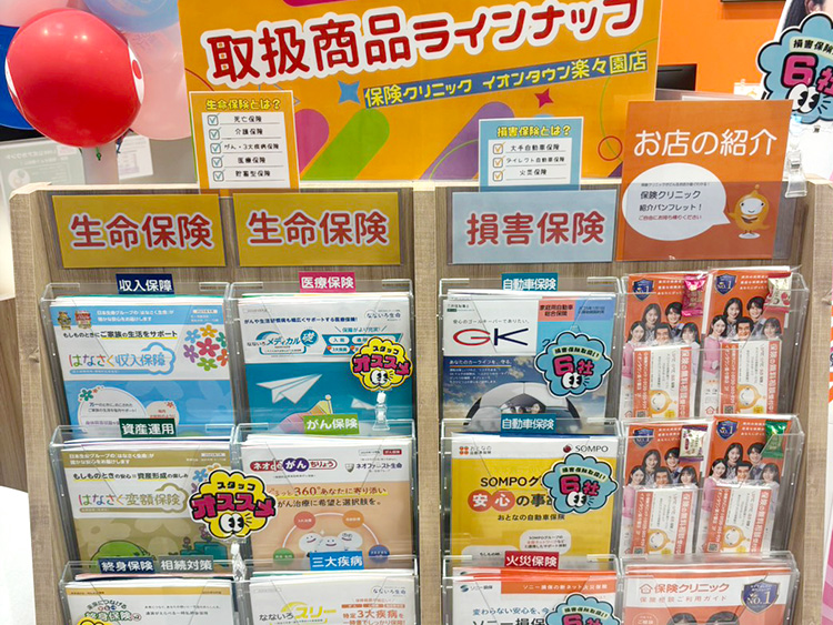 各種保険商品をカテゴリーごとにわかりやすく設置しております。ご自由にお手に取っていただけますので、ご来店の際はぜひ最新の資料をご覧ください。スタッフが内容のご相談や説明も承ります。