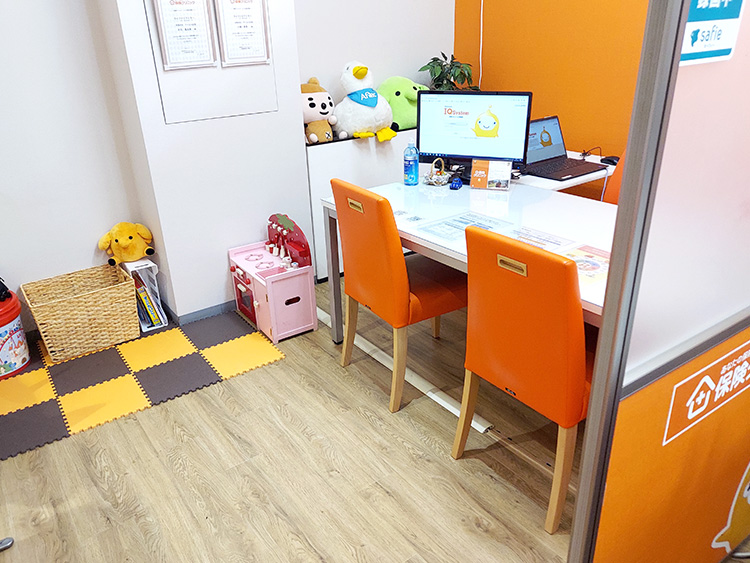当保険ショップでは、小さなお子さま連れでも安心してご相談いただけるようキッズスペースを完備しています。駐車場もご用意しておりますので、お車でのお越しも便利です。
