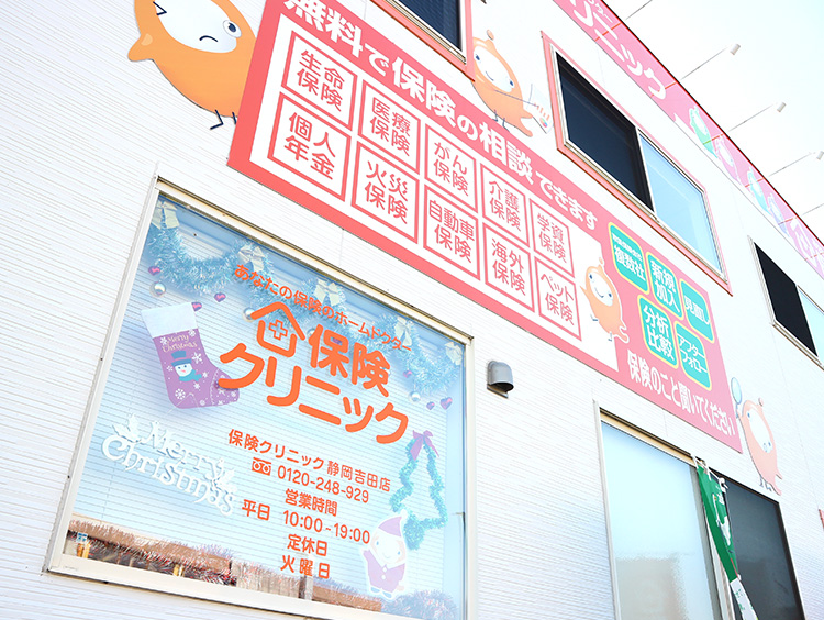 「保険クリニック静岡吉田店」は、各保険会社の商品を比較しながら、あなたにぴったりな保険を見つけることができる保険ショップです。お客様のライフステージやニーズに合わせて、生命保険や損害保険の見直しや新規加入をサポートし、お客様1人1人にぴったりな保険プランをご提案いたします。「吉田IC」より車で約10分の立地で、榛原郡からはもちろん、島田市や藤枝市、牧之原市などからも多くのお客様にご利用いただいています。