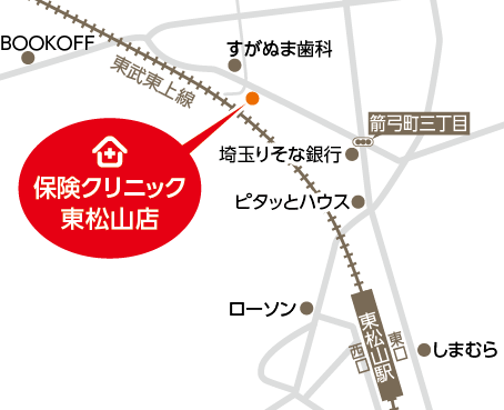 東松山駅からは徒歩約8分です。駐車場もございますので、東松山市のほか、北本市、鴻巣市、桶川市、滑川町、吉見町、川島町、坂戸市方面からもお越しいただいております。