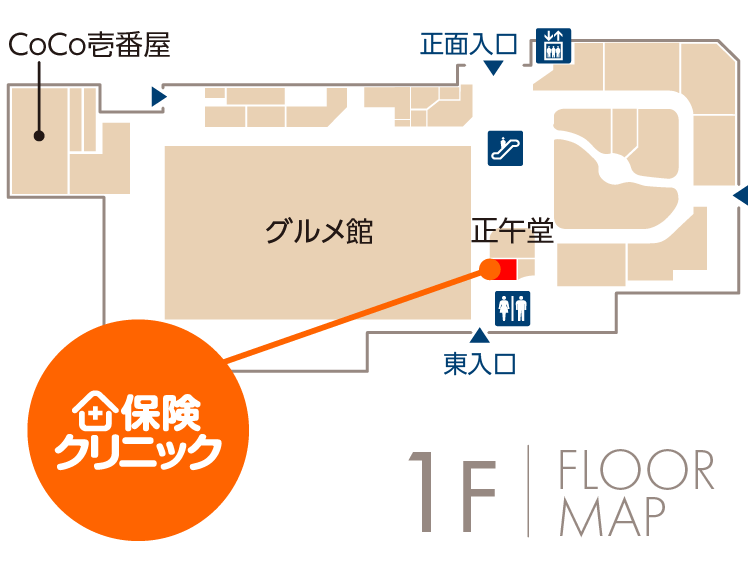 保険クリニック武生楽市店はサンドーム福井から約7分、武生楽市1階にございます。南入口から入ってすぐ、お隣は宝飾店「正午堂」です。