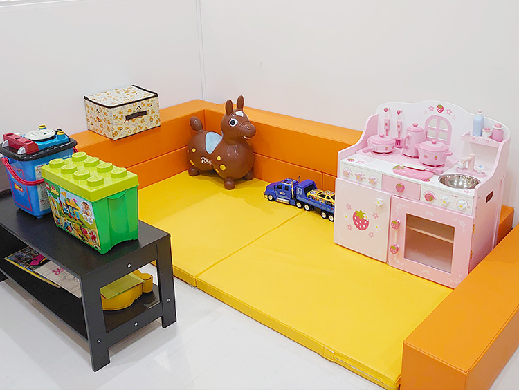 広々としたキッズコーナーでパパもママも安心です。授乳スペース、おむつ交換スペースも店舗近くにあります。