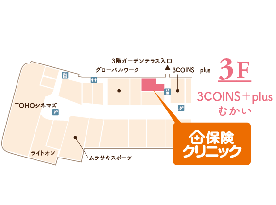保険クリニックイオンモール水戸内原店は3F「SAAD(アクセサリー)」「アーノルドパーマー(ファッション)」の近くにございます。同フロアには大型フードコートや「TOHOシネマズ」、「こどものあそびば」などファミリーで楽しめる施設が充実しています。