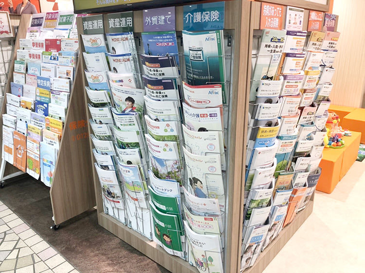 取扱保険会社は約50社。気になる商品のパンフレットはぜひお持ち帰りください。