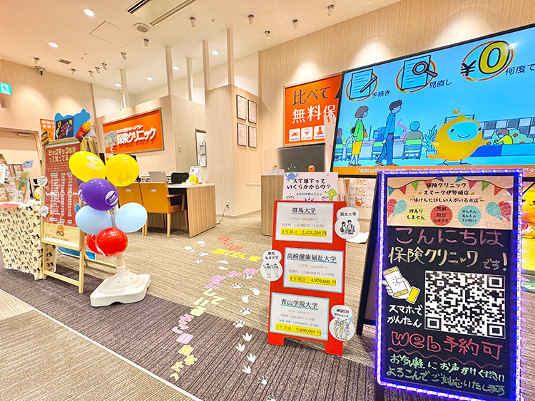 保険クリニックスマーク伊勢崎店では、複数の保険会社の商品を比較しながら、お客様一人ひとりにぴったりの保険プランを見つけるお手伝いをいたします。ご家族構成や将来設計に基づいて、生命保険や損害保険の新規相談や見直しのご相談を承っておりますのでお気軽にお問い合わせください。JR両毛線 「伊勢崎駅」よりバスで約15分の立地で、宮子町や茂呂町などの伊勢崎市からはもちろん、みどり市や高崎市からも多くのお客様にご利用いただいています。