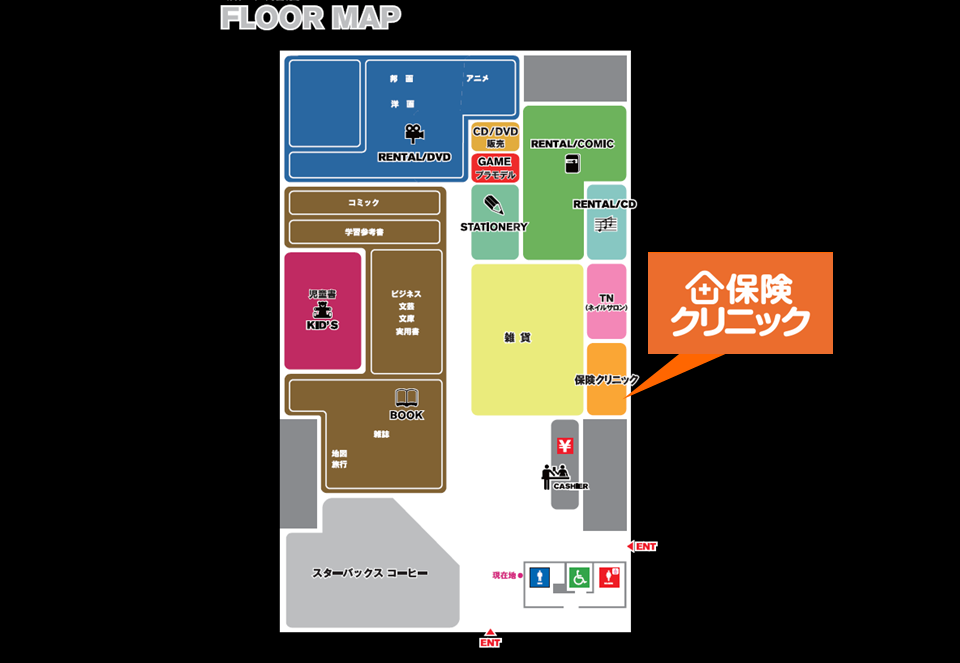 TOPさんのお隣、スターバックスさん併設のTSUTAYA店内にございます。お買い物のついでにぜひお立ち寄りください。
