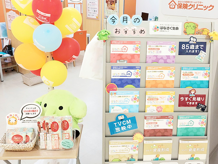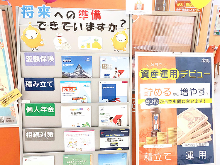 医療保険やがん保険、学資保険など。各社のパンフレットをお持ち帰りいただけます。