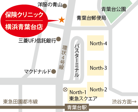 東急電鉄田園都市線「青葉台駅」北口を出て徒歩約3分、郵便局下交差点に当店があります。