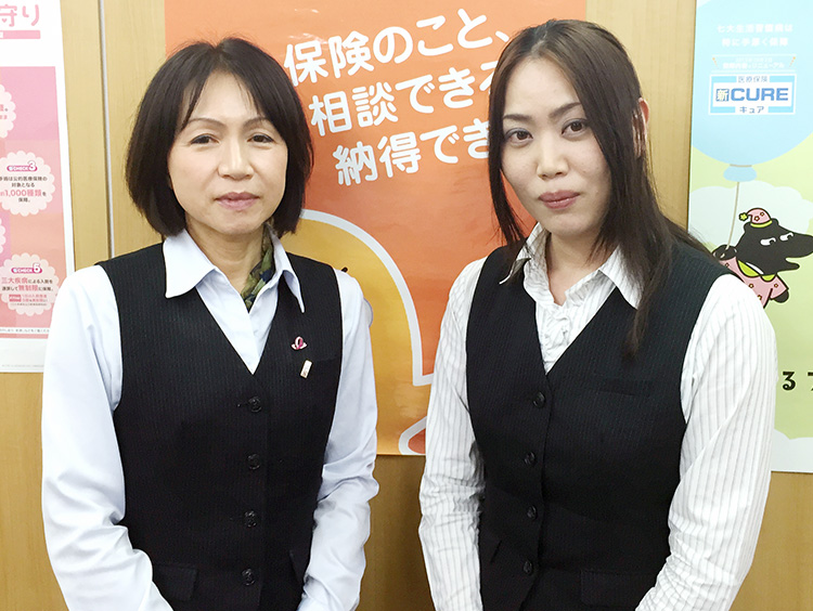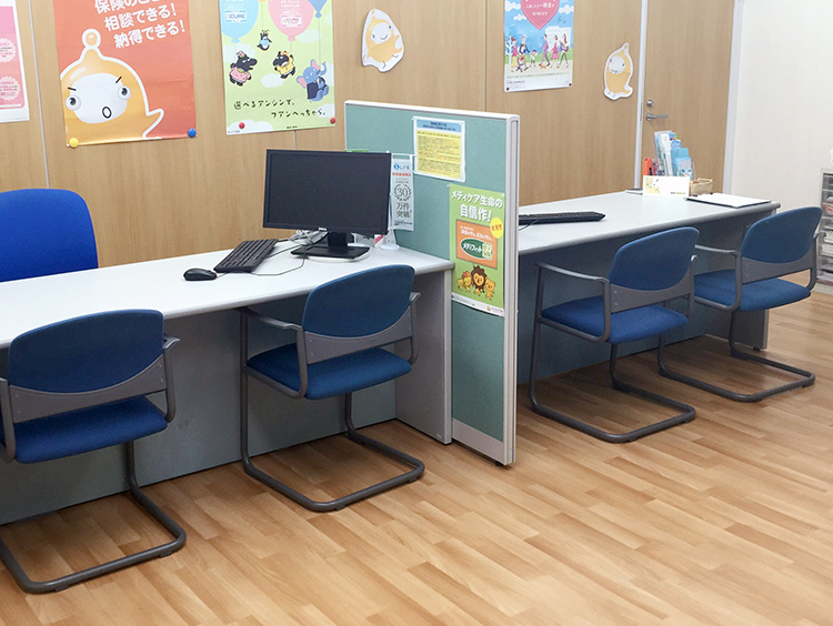 土日祝日も営業。医療保険やがん保険、火災保険など、約20社の保険を取り扱っています。