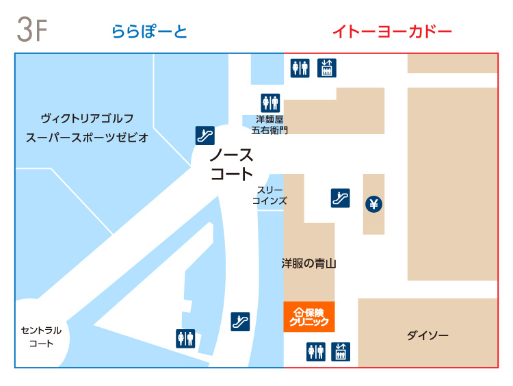 イトーヨーカドーららぽーと横浜店3階、洋服の青山の隣りにございます。