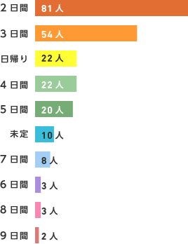 旅行(帰省)を予定している213名に日程を聞いたところ、1位は2日間、2位は3日間、3位は日帰りと短い日程が多いことが分かりました。