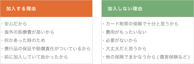 加入する方は「安心」や「万が一」との意見が多く、加入しない方は「カードに付帯されている」「必要ない」との意見が寄せられました。