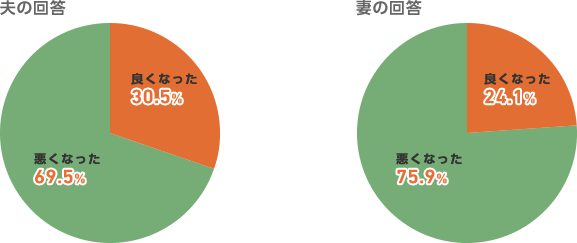 ギャップ(違い)があると回答した344名にそのギャップ(違い)が新婚時代と比べて良くなったのか、悪くなったのか聞いたところ、72.7%(250名)が悪くなったと回答しました。ただ性別で比較してみると、女性の方が「悪くなった」と回答する意見が少し多かったです。