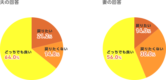 40歳~60歳までの男性250名、女性250名に新婚時代戻りたいか聞いたところ、どちらも半数以上は『どっちでも良い』と回答しました。しかし、男性は『戻りたい』が次に多いのに対し、女性は『戻りたくない』が多く、男性の『戻りたくない』と回答した人の2倍いる事が分かりました。