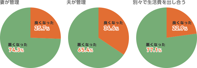 また、管理の仕方ごとに新婚時代からのギャップ(違い)を見てみると、「夫が管理」(34.6%)、「妻が管理」(25.7%)、「別々で生活費を出し合う」(22.9%)の順に「新婚時代よりギャップ(違い)が良くなった」と回答していることが分かりました。