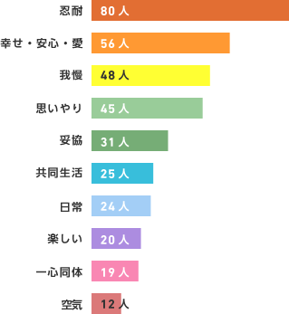 1位は『忍耐』、2位は『幸せ・安心・愛』、3位は『我慢』、4位は『思いやり』と続いています。