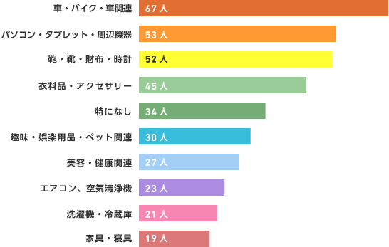 今年購入したもので、一番高かった買い物聞いたところ、1位は『車・バイク・車関連』、2位は『パソコン・タブレット・周辺機器』、3位は『鞄・靴・財布・時計』の順でした。