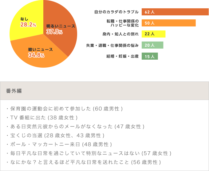 2015年、今年の自身に起こったニュースを聞いたところ、明るいニュースが37.0%で一番多くなりました。