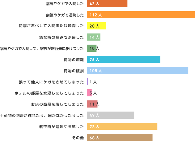 実際にトラブルに遭遇した500名で一番多かったのが「病気やケガで通院した」22.4%(112名)でした。続いて「荷物の破損」(21.0%)、「荷物の盗難」(15.2%)、「航空機が遅延や欠航した」(14.6%)となっています。