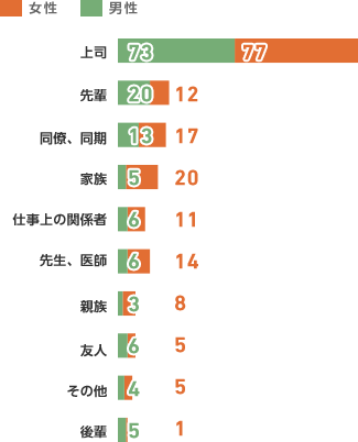 ハラスメントや嫌がらせをどんな人がしてきたか聞いたところ、ダントツの1位は上司(70.4%)でした。