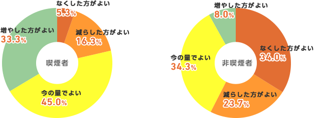 喫煙者の21.7%(65名)、非喫煙者の57.7%(173名)は、今よりも少なくなって良いとの回答でした。