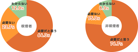 喫煙者の64.3%(193名)、非喫煙者の76.7%(230名)が必要だと感じています。