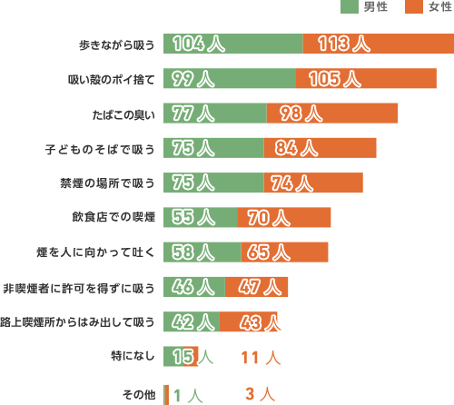 1位は「歩きたばこ」72.3%、2位は「吸い殻のポイ捨て」68%、3位は「たばこの臭い」58.3%でした。