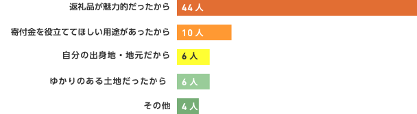 他に、災害復興や観光など応援したい事業や用途を挙げている人が10名、「ふるさと納税」の名の通り自分の出身地・地元が6名、住んだことがあるなどゆかりのある自治体だったという人が6名と続きました。