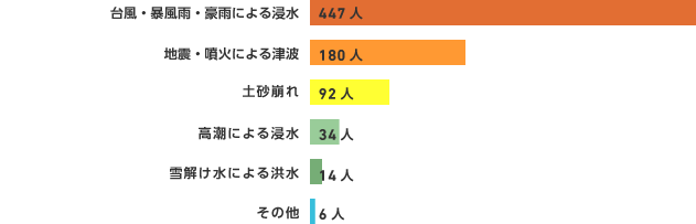 74.5%にあたる447名が、「台風・暴風雨・豪雨による浸水」が心配と回答しており、次いで「地震・噴火による津波」「土砂崩れ」と続きました。