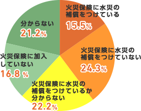加入している火災保険に水災の補償をつけている人は15.5%(93名)で、火災保険に水災の補償をつけていない人の方が24.3%(146名)と多いことが分かりました。