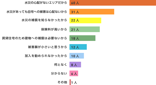 「水災の心配がないエリアだから」が最も多く60名(41.1%)、「水災があっても自宅への被害は心配ないから」(マンションの上層階など)31名(21.2%)の順となりました。
