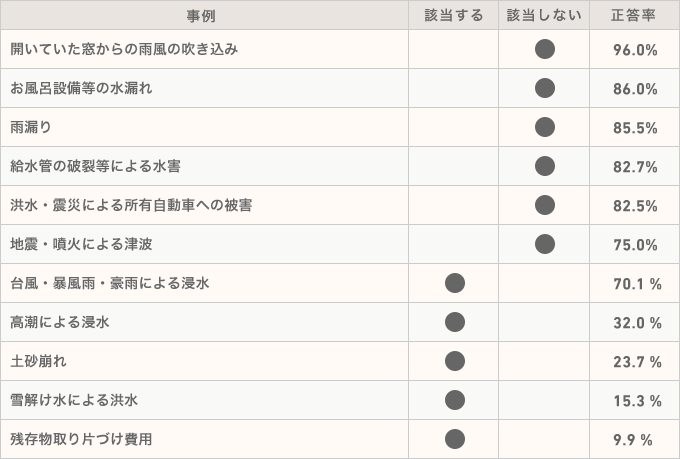 「地震保険」や「水濡れ」の特約に該当するなど、「水災補償」の対象外である損害であるほど正答率が高く、高潮・土砂崩れ・雪解け水による洪水など、「水災補償」の対象である損害は正答率が低い傾向にありました。