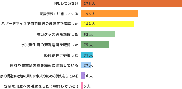 ハザードマップで地域の水災の危険度を把握すると共に、防災グッズの準備や避難場所の確認等、自宅付近で水災が起こった時に、すぐに自身の身を守る行動ができるように普段からの意識づけが大切です。