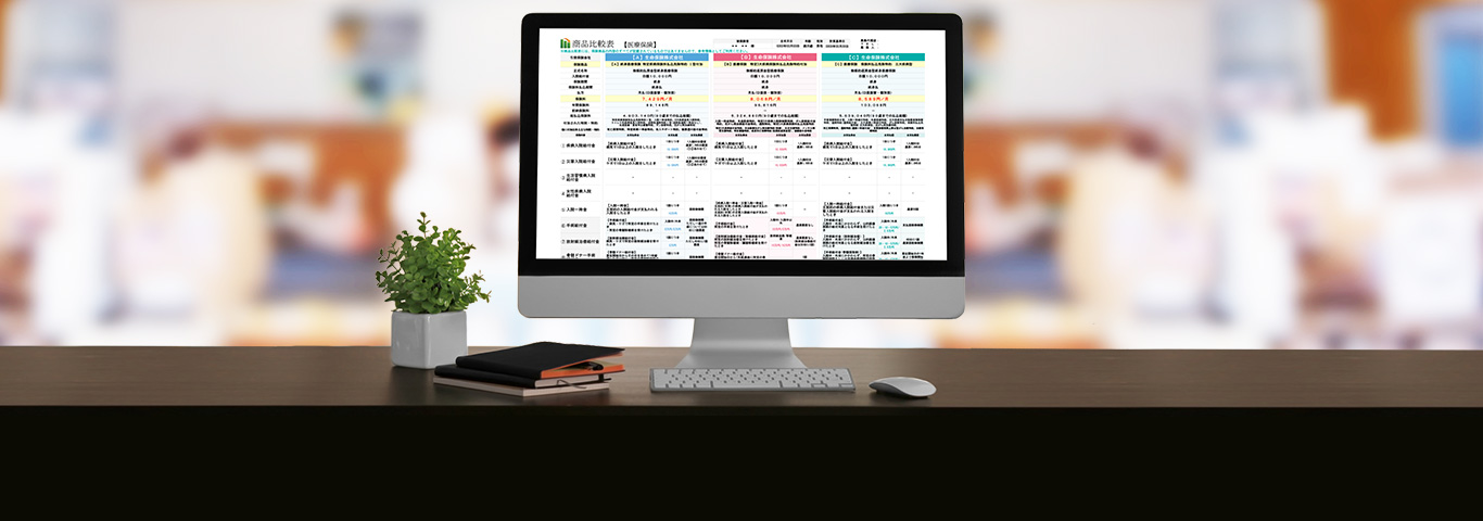 当社システムで、一目でかんたんに保障内容を比較することができます。通常のショップではお渡しできない「保険まるわかりシート」を無料配布していますので、持ち帰ってゆっくりご検討いただけます。