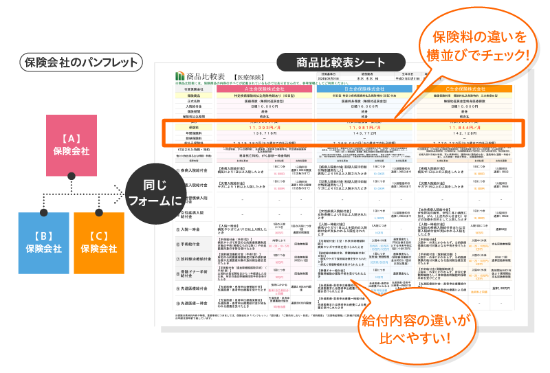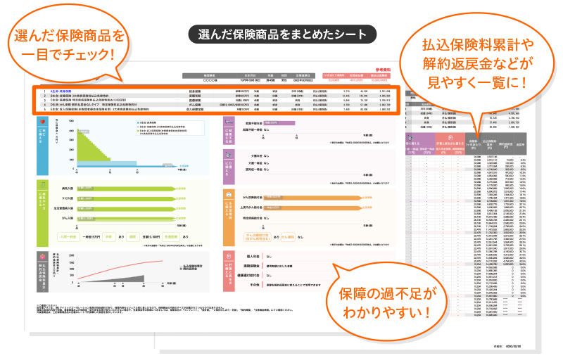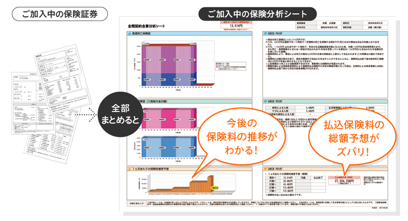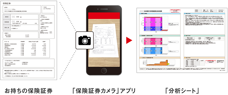 保障内容や金額等を、生命保険募集人がスマートフォンやタブレット等のカメラで撮影やスキャナでデータ化するだけで、保険の内容をビジュアルで分かりやすくした「分析シート」を作成します。