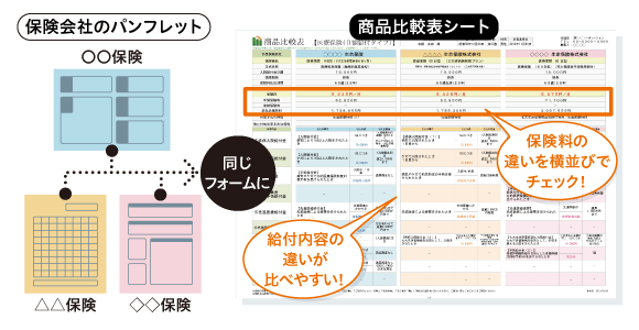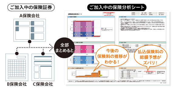 現在加入している保険の内容をビジュアルで分かりやすくした「分析シート」、異なる保険商品を同一のフォーマットで比較できる「比較表」等の機能を有する、保険の”わかりにくい”を”わかりやすく”する業界唯一のシステムです。