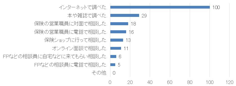 「インターネットで調べた」という回答が最も多くありました。また保険の営業職員や保険ショップで対面での相談のほか、オンライン面談を使用した人もいました。