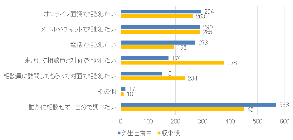 外出自粛における場合は、非対面となる「オンライン面談で相談したい」「メールやチャットで相談したい」「電話で相談したい」との回答がいずれも20%前後と多く、一方で「来店して相談員と対面で相談したい」「相談員に訪問してもらって対面で相談したい」との回答は10~12%と少ない結果となりました。