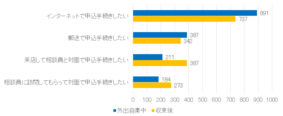 外出自粛における場合は「インターネットで申込手続きしたい」 「郵送で申込手続きしたい」といった非対面での手続きを希望する回答が多く、一方で「来店して相談員と対面で申込手続きしたい」「相談員に訪問してもらって対面で申込手続きしたい」といった対面での手続きを希望する回答は少ない結果となりました。