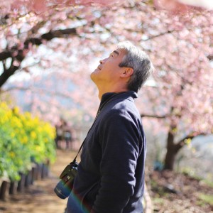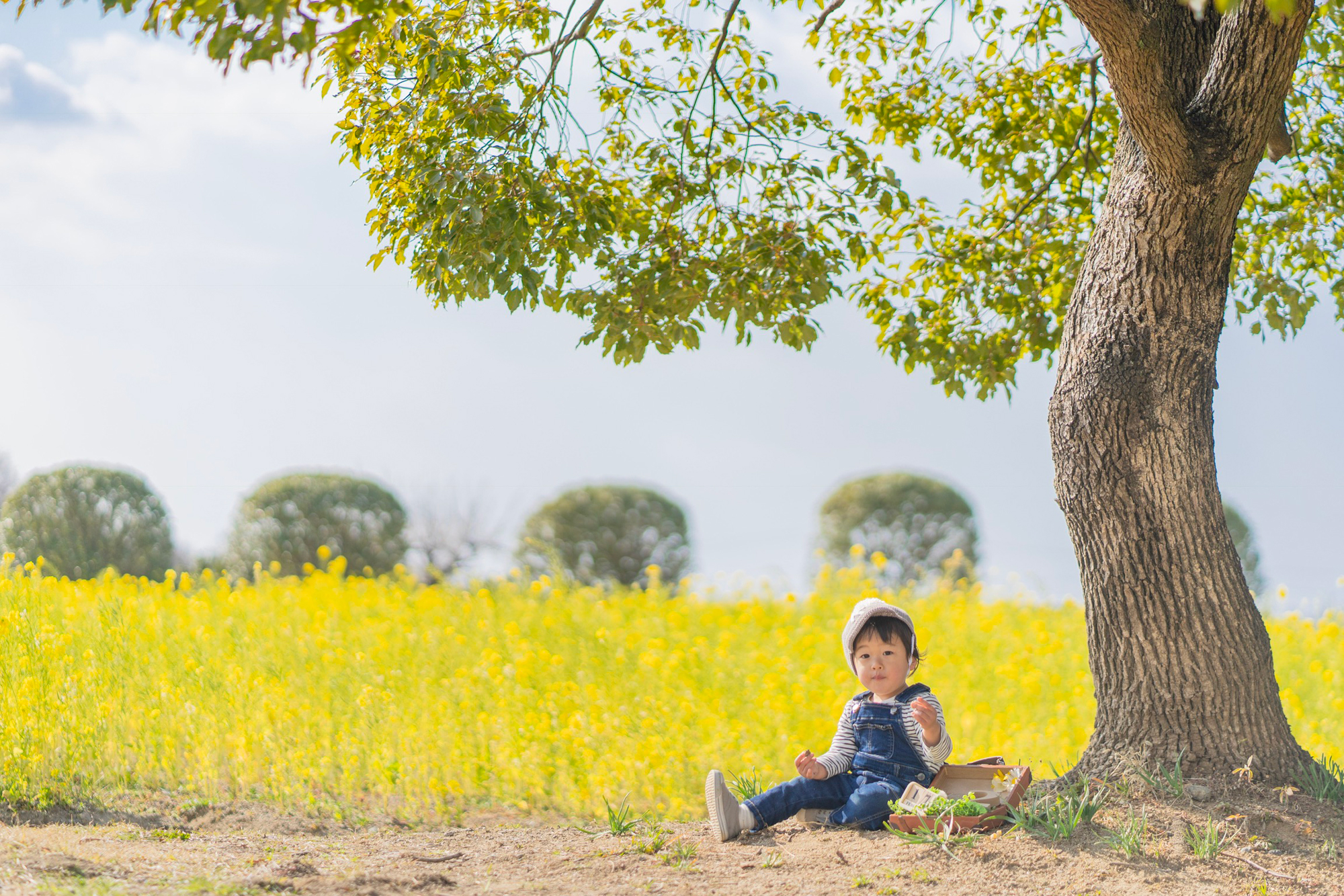 綺麗な菜の花畑の前で風を感じて素敵な表情の息子くん。