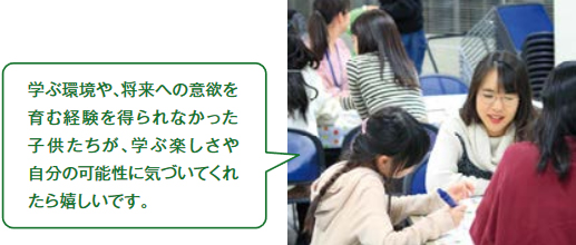生まれ育った家庭やさまざまな事情から、健やかな成長に必要な生活環境や教育の機会が確保されていない子供がいます。それぞれの家庭にどんな事情があろうとも、生まれ育った環境によって子供の将来が閉ざされることがあってはなりません。
