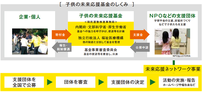 子供たちの未来を応援することは、 「未来への投資」と考え、国は関連する法律などを施行して対策の充実強化に取り組んでいます。同時に、地域密着の草の根支援などに柔軟に対応する基金を創設し、 企業や個人から広く寄付を募り、子供たちへの支援を行う団体の活動資金として活用しています。