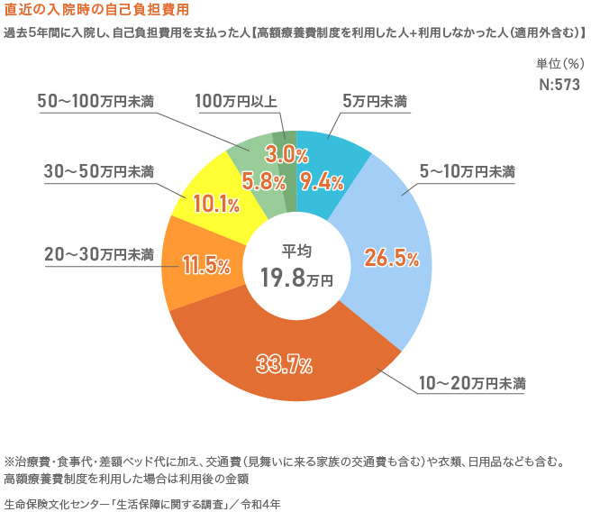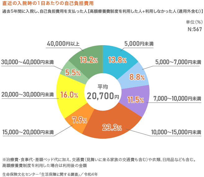 差額ベッド代、入院時食事代等を含めた入院時にかかった費用の平均は19.8万円となっています。 費用の分布を見てみると「10~20万円未満」が33.7%、「5~10万円未満」が26.5%、「20~30万円未満」が11.5%となっています。 1日あたりの自己負担費用の平均は20,700円となっています。費用の分布を見てみると「10,000円~15,000円未満」が23.3%と一番多くなっていますが、 1日に20,000円以上負担した人も34.7%と3人に1人となっています。65.9%の方が1日あたり10,000円以上の負担となっています。